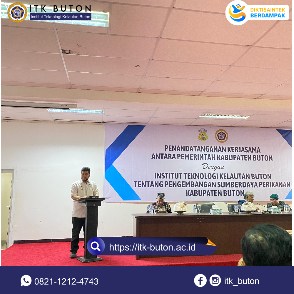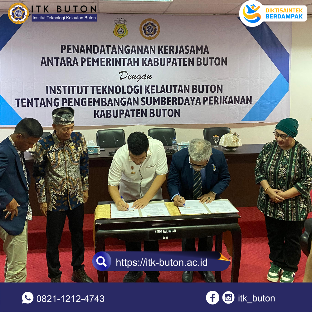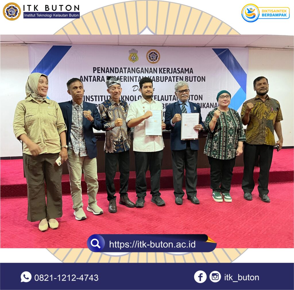 Sabtu, 12 Juli 2025 di Aula Kantor Bupati Buton (Takawa) telah terlaksana penandatanganan kerjasama antara Pemerintah Kabupaten Buton dan Institut Teknologi Kelautan Buton tentang pengembangan sumberdaya perikanan Kabupaten Buton.