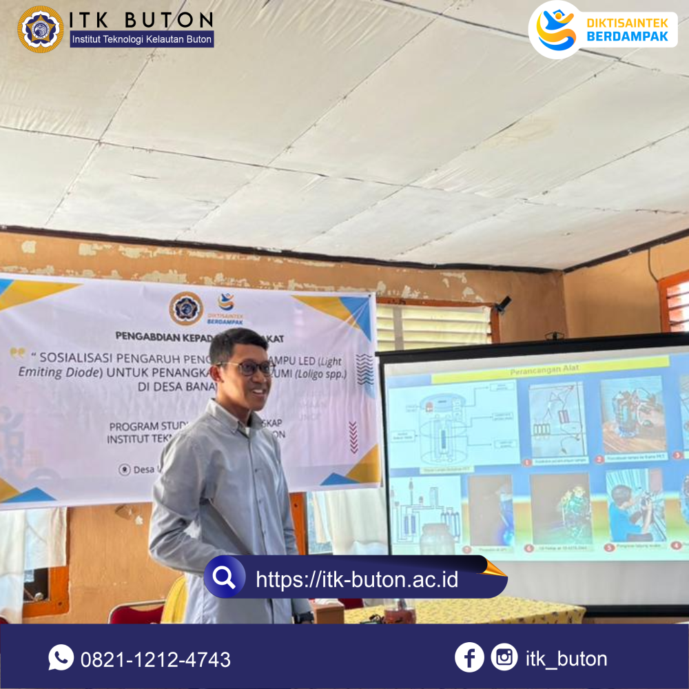 Sosialisasi pengaruh penggunaan lampu LED (Light emitting diode) untuk penangkapan cumi-cumi (Loligo spp.) dipaparkan oleh Bapak Andre Pangestu Hadi, S.Tr.Pi., M.Tr.Pi. selaku Dosen Prodi Perikanan Tangkap ITK-Buton. Materi ini diinisisasikan untuk mendukung masyarakat pesisir khususnya nelayan dalam mengoptimalkan hasil tangkapan terutama dari komoditas cumi-cumi. Secara biologi cumi-cumi memiliki fototaksis positif (suka terhadap cahaya) dan juga mampu mengeluarkan cahaya dari tubuhnya sebagai bagian dari cara berkomunikasi atau disebut dengan Biolumensi. Dari sisfat fototaksis positif dan Biolumensi ini menjadi basis penggunaan lampu LED portable yang diinovasikan dengan memanfaatkan limbah botol plastik sebagai wadah yang digunakan untuk menarik cumi-cumi (Loligo spp.) saat dilakukan penangkapan.