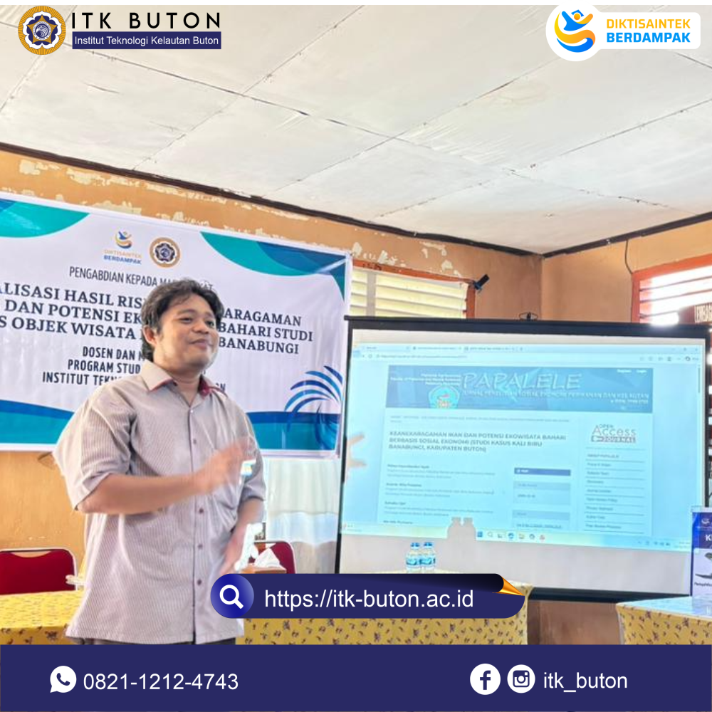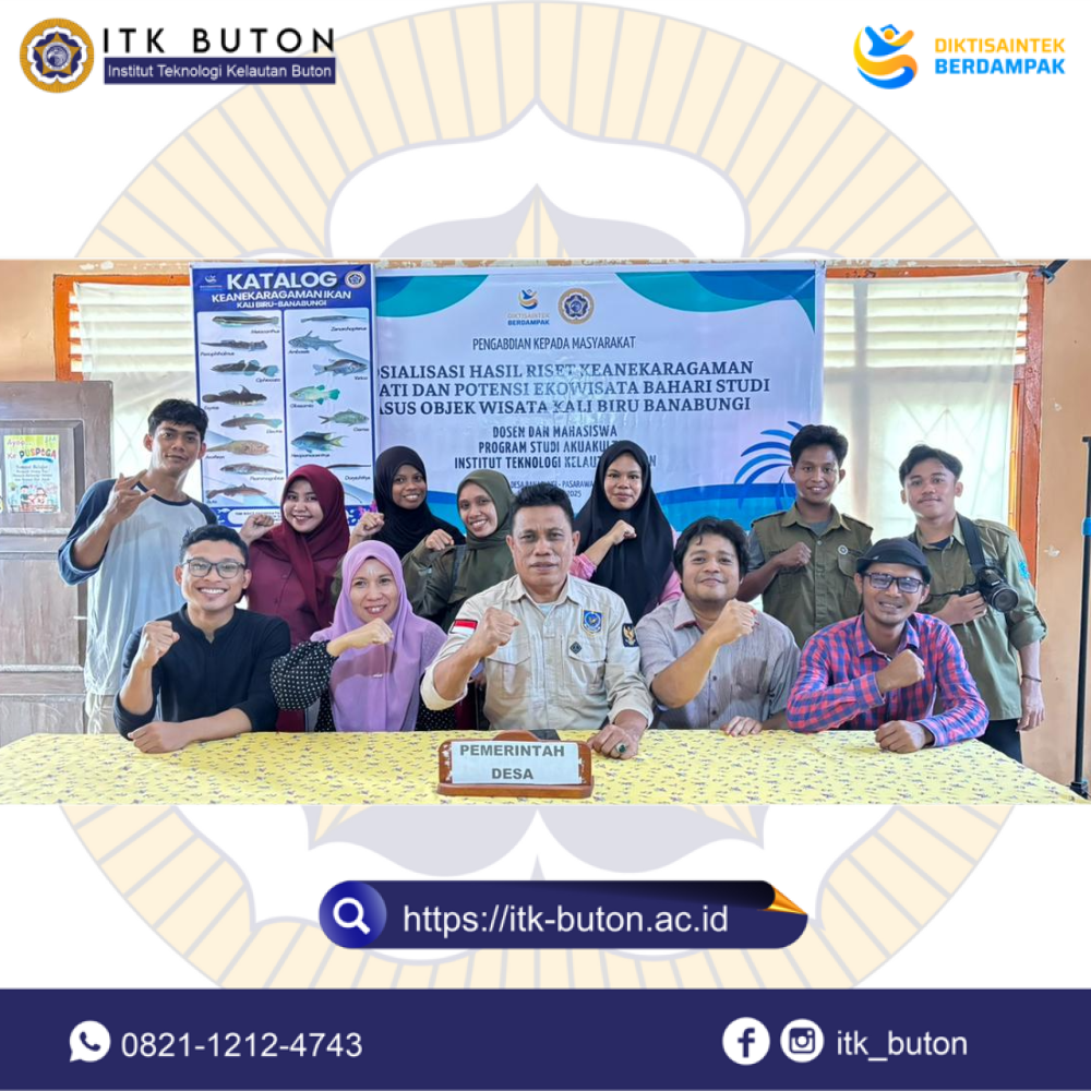 Sosialisasi Hasil Riset Keanekaragaman Hayati dan Potensi Ekowisata Bahari Studi Kasus Objek Wisata Kali Biru Banabungi merupakan tindak lanjut dari terlaksananya kegiatan penelitian Dosen dan Mahasiswa dari Program Studi Akuakultur ITK-Buton yang dilaksanakan pada bulan Oktober 2025. Pemaparan materi disampaikan oleh Bapak Ananta Wira Pratama, S.Pi., M.Si. selaku Dosen Prodi Akuakultur dan juga periset Ekowisata Bahari Banabungi. Selain menyampaikan uraian dari hasil riset yang diperoleh, pemaparan juga memuat tentang strategi dan upaya pemanfaatan serta pengembangan objek wisata kali biru Banabungi berbasis konservasi dan ramah lingkungan. Dari hasil riset ini kemudian dibuatkan Katalog keanekaragaman ikan yang ada di Objek Wisata Kali Biru Banabungi yang kemudian diserahkan secara simbolik oleh Bapak Prima Insamilandari Syah, S.Tr.Pi, M.M. sebagai Ketua Tim Riset Ekowisata Bahari Studi Kasus Objek Wisata Kali Biru Banabungi kepada Kepala Desa Banabungi.